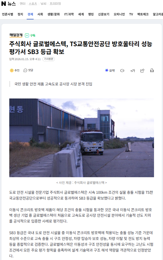 ¸ÅÀϰæÁ¦_TSÇѱ¹±³Åë¾ÈÀü°ø´Ü_¹æÈ£¿ïŸ¸® ¼º´ÉÆò°¡¼ SB3 µî±ÞÈ®º¸_º¸µµÀÚ·á